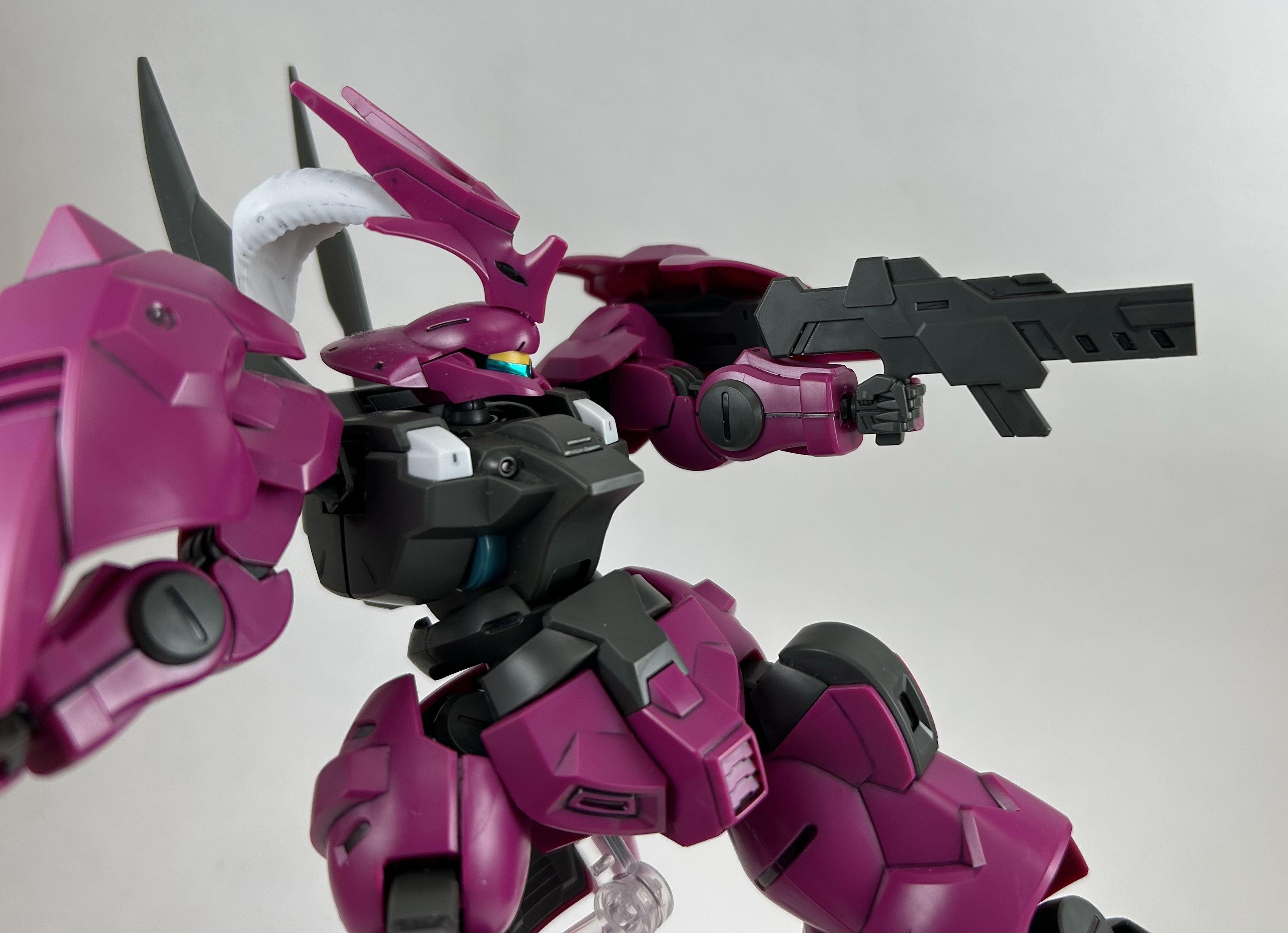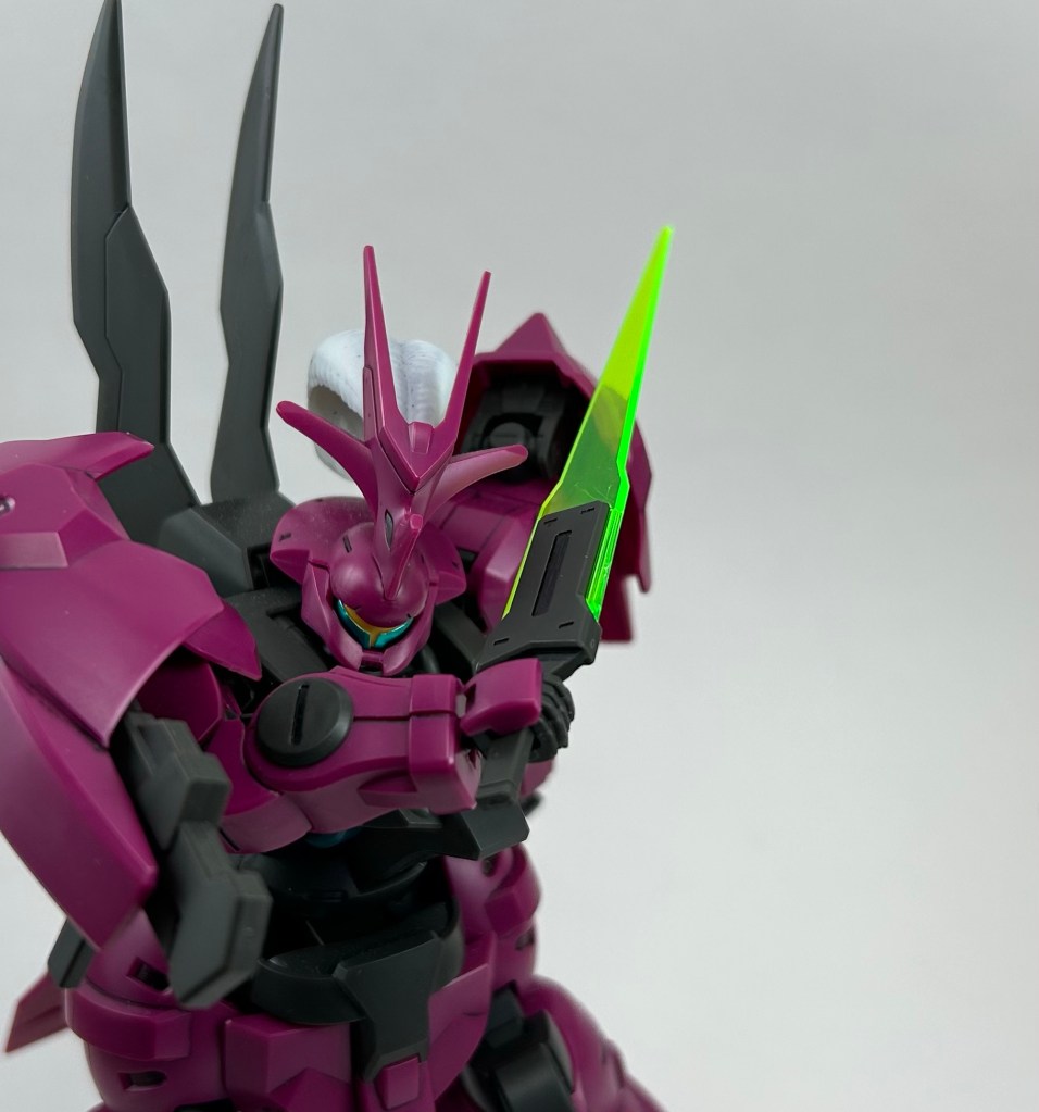 “Among the basic MS Dilanza units developed by Jeturk Heavy Machinery, a number have been customized for their pilots. One of these has been modified to suit the piloting style of Guel Jeturk, heir to the company. Its outward appearance has also been tailored to fit Guel’s penchant for the ostentatious. Painted in a vivid magenta and fitted with a decorative headpiece, this unit embodies the skill and unshakeable self-confidence which made Guel, Asticassia’s best pilot. It gives the impression that no other unit could be worthy of such a pilot.”
